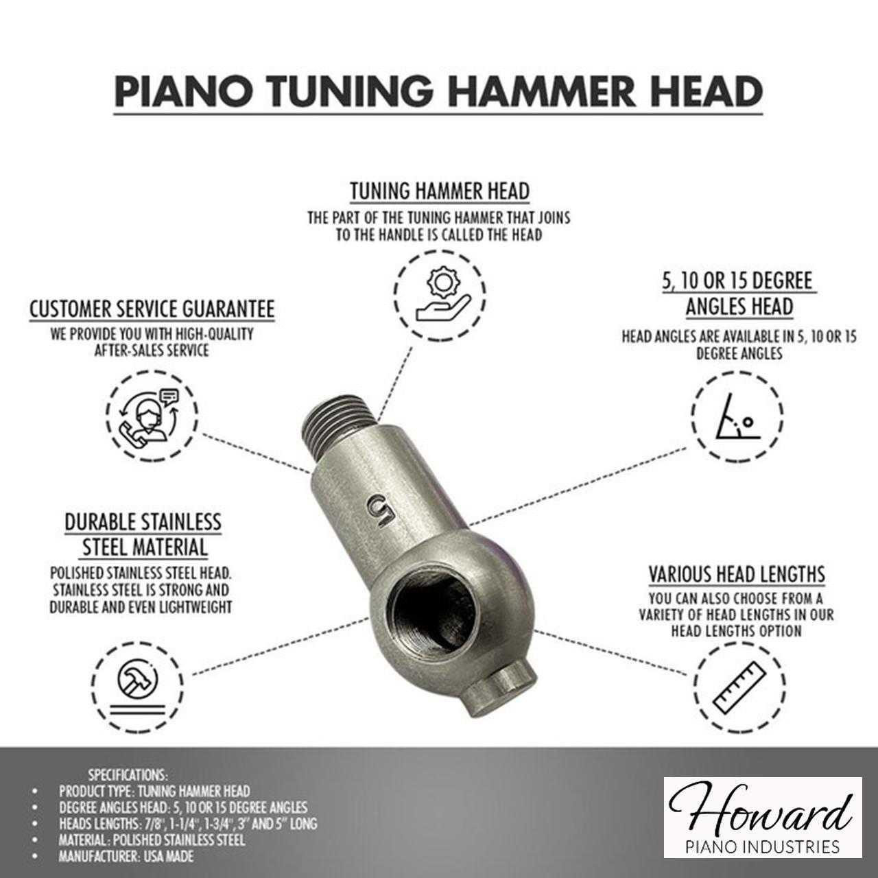 - 5, 10 OR 15 DEGREE ANGLES HEAD: The degree to which the handle extends away from the tuning pins is determined by the angle of the head. Head angles are available in 5, 10, or 15 degree angles. The 5 degree head angle will put the tuning hammer the closest to the tuning pins where the 15 degree angle will extend the handle further away from the pins.