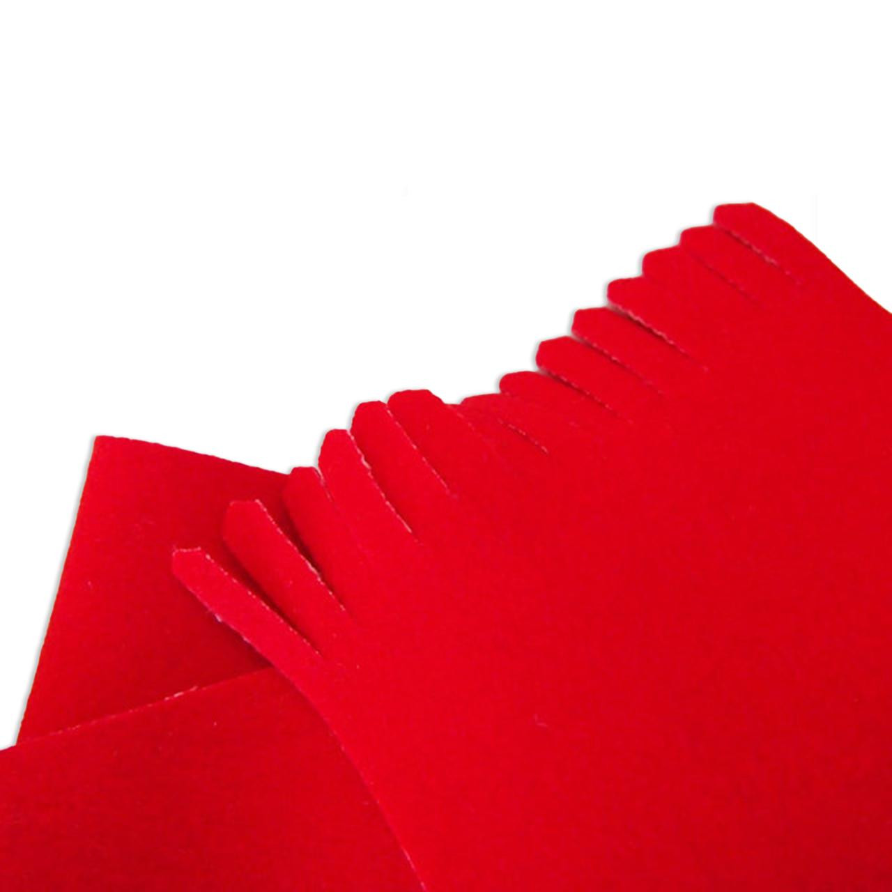 This Piano Flange Bushing Cloth is a quality scarlet red flange bushing cloth with white center in a sheet of 12 strips that are 17/64" wide and 18" long each. The ends of each strip are notched for easily being able to insert into the flange holes. The torn edges of the felt join together better in the flange than cut edge felt. Felt is .050" thick.