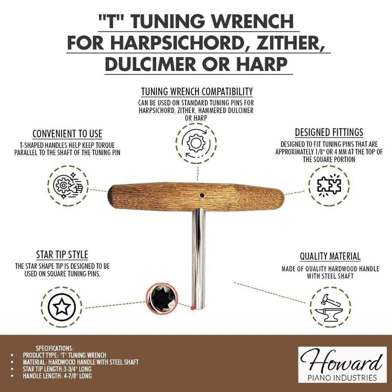 This "T" Tuning Wrench fits standard tuning pins on harpsichords, zithers, hammered dulcimers, and harps. A tuning wrench is a type of socket wrench that is used to tune string instruments that have strings wrapped around tuning pins. This handy tuning wrench’s polished handle sits laterally in the palm of your hand to allow for easing handling and ultimate control while you adjust your piano’s pins.